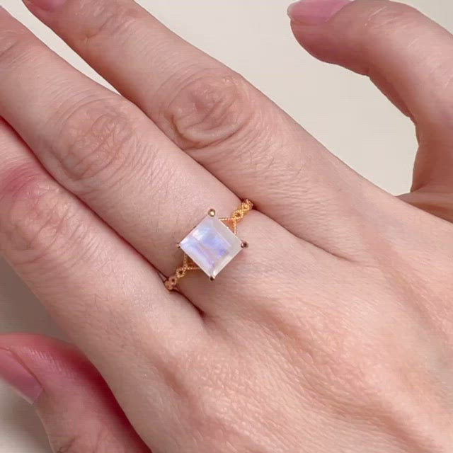 シンプルでありながらエレガント!テーブルカットの天然ムーンストーンが魅惑的な輝きを放つ、ロイヤルグラム ムーンストーン リング。婚約指輪としてはもちろん、自分へのご褒美にも最適なギフトです。この美しいリングが持つ、時代を超えた美しさで、あなたのジュエリーコレクションをさらに輝かせましょう。